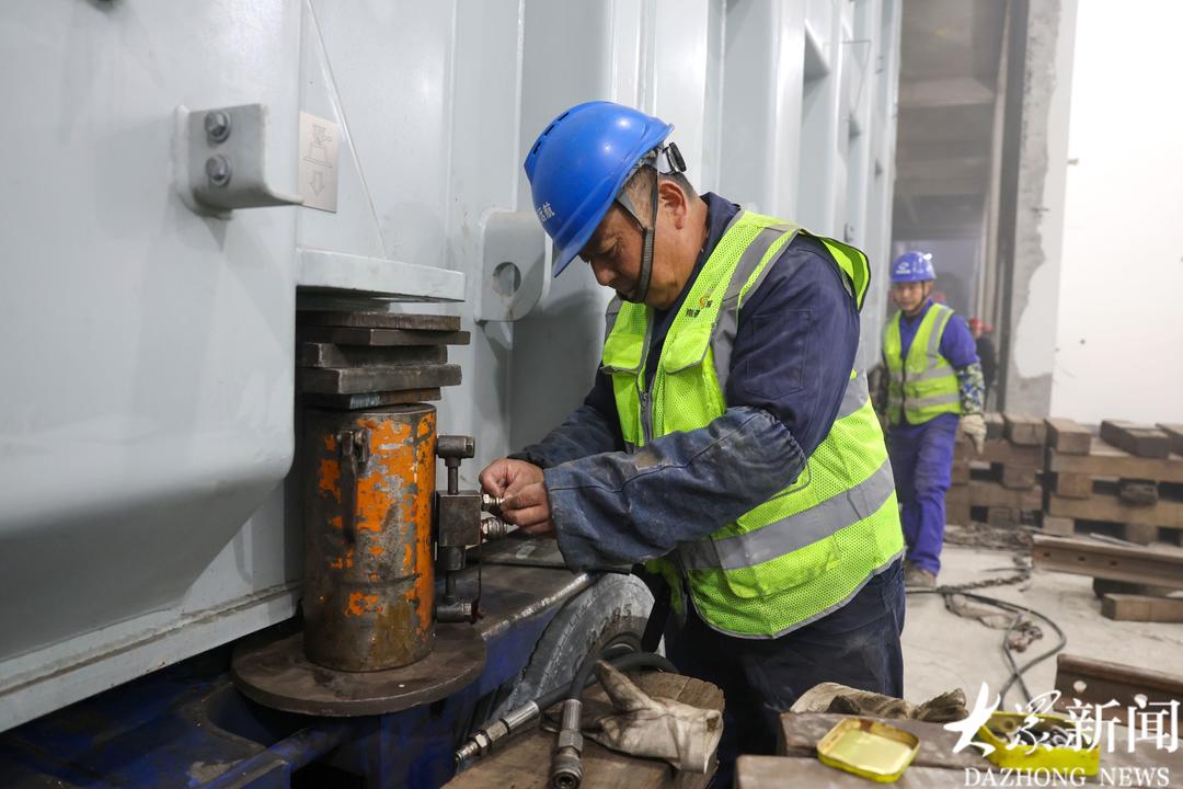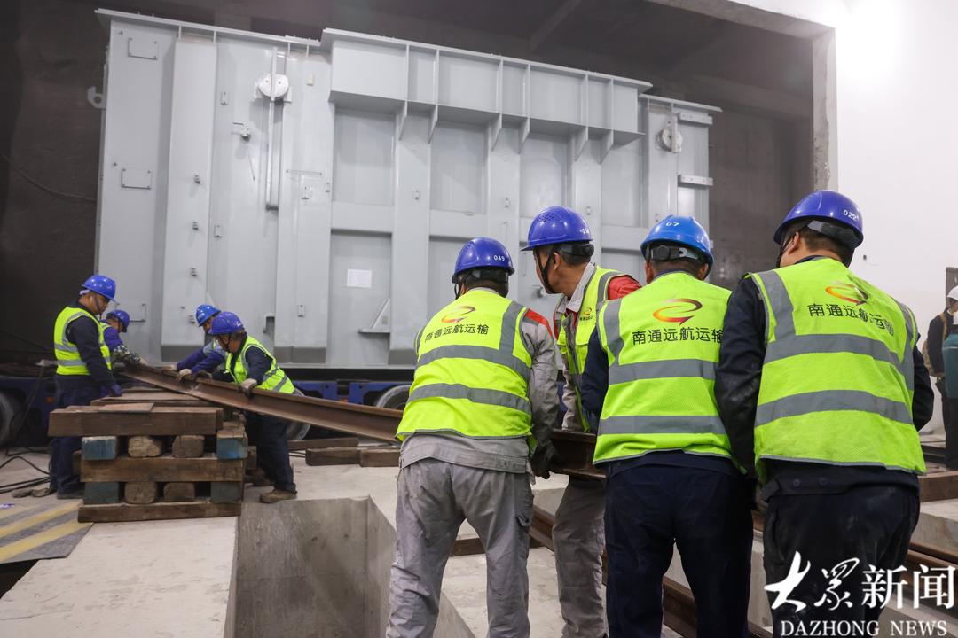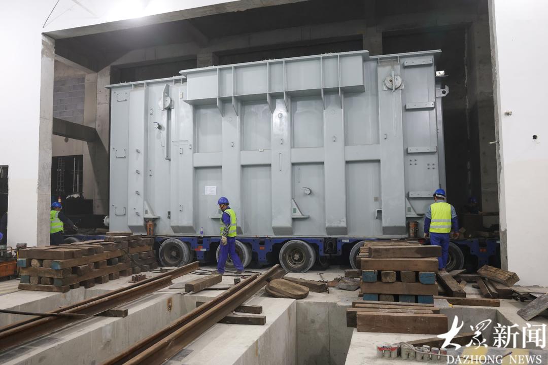 承担如此重任的主变压器,其体型和重量都十分惊人。这台设备长近9米,宽3.76米,高4.16米,额定容量360兆伏安。要把这个重达216吨的“大块头”从地面运送到深埋地下的厂房,并实现精准就位,是一场不小的考验。
