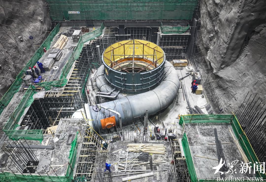 作为连接电站机组与电网的“能量枢纽”,刚刚就位的主变压器,就是这个“充电宝”的核心设备之一。它的工作机制非常“聪明”:当夜晚来临,城市进入用电低谷期时,它将电网输送来的电能降压,驱动抽水机组将水从下水库抽到上水库,把电能转化为水的势能储存起来,相当于给大山“充电”;当白天用电高峰来临时,它又将上水库下泄水流发电产生的电能升压至500千伏,并入山东电网,实现能量的回馈。