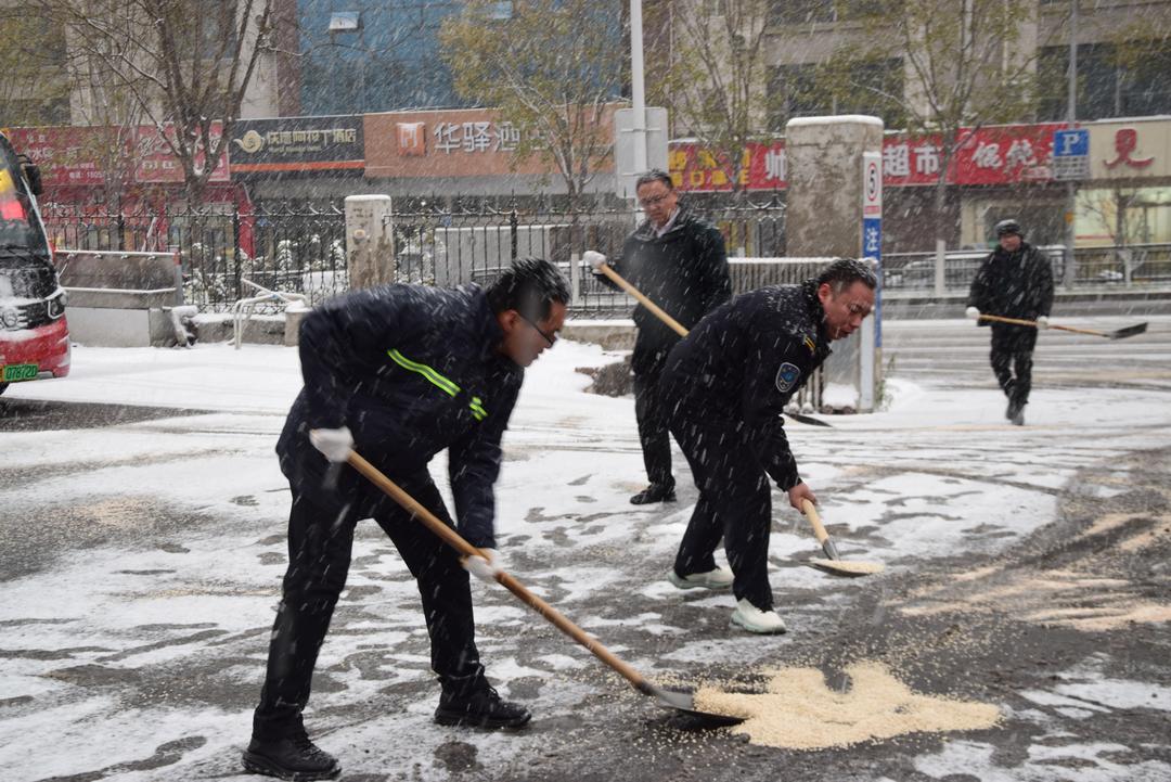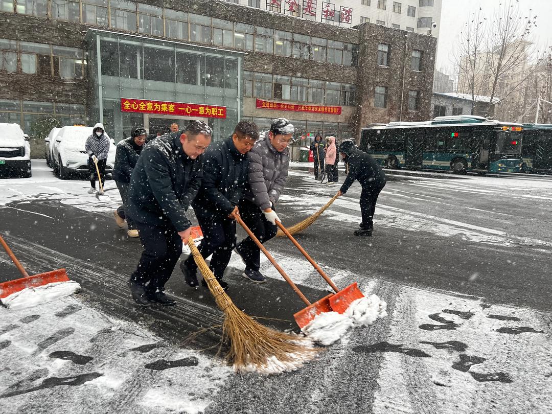 虽然雪花越来越大,但车队所属的11条线路都正常发车,偌大的车场车来车往。为了保证行车安全,车队队长李艳东与收车回来的驾驶员一块撒起了融雪剂。李艳东说:“最近一直关注气象信息,我们提前备足了防滑物资与除雪设备,提前做好车辆维修保养和安全设施检查,加强对营运车辆刹车制动、灯光、雨刷等安全设施的检查和维修,确保车辆技术状况良好。”
