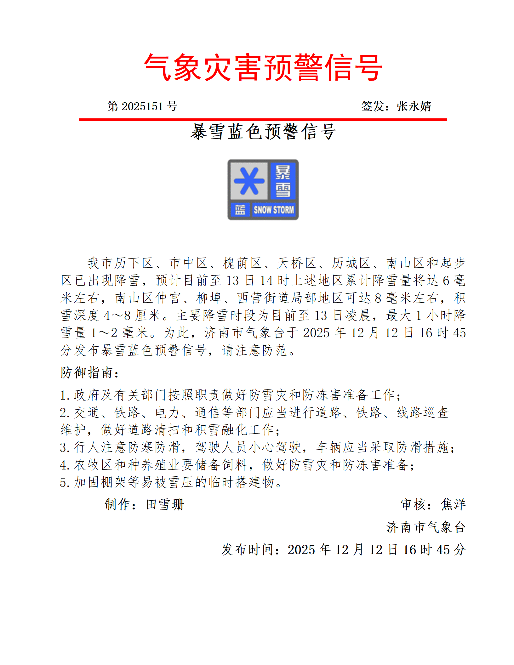 济南市气象台于2025年12月12日16时45分发布暴雪蓝色预警信号:济南历下区、市中区、槐荫区、天桥区、历城区、南山区和起步区已出现降雪,预计目前至13日14时上述地区累计降雪量将达6毫米左右,南山区仲宫、柳埠、西营街道局部地区可达8毫米左右,积雪深度4~8厘米。主要降雪时段为目前至13日凌晨,最大1小时降雪量1~2毫米。