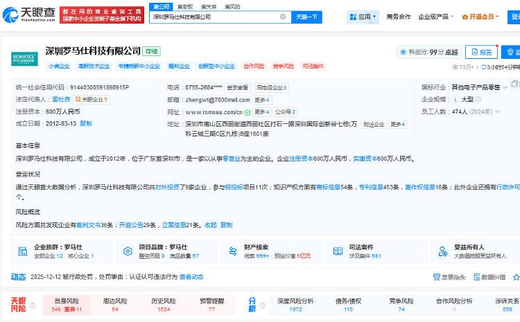 另据天眼查网站,目前,深圳罗马仕科技有限公司共有348条自身风险,54条周边风险,1624条历史风险,以及77条预警提醒。