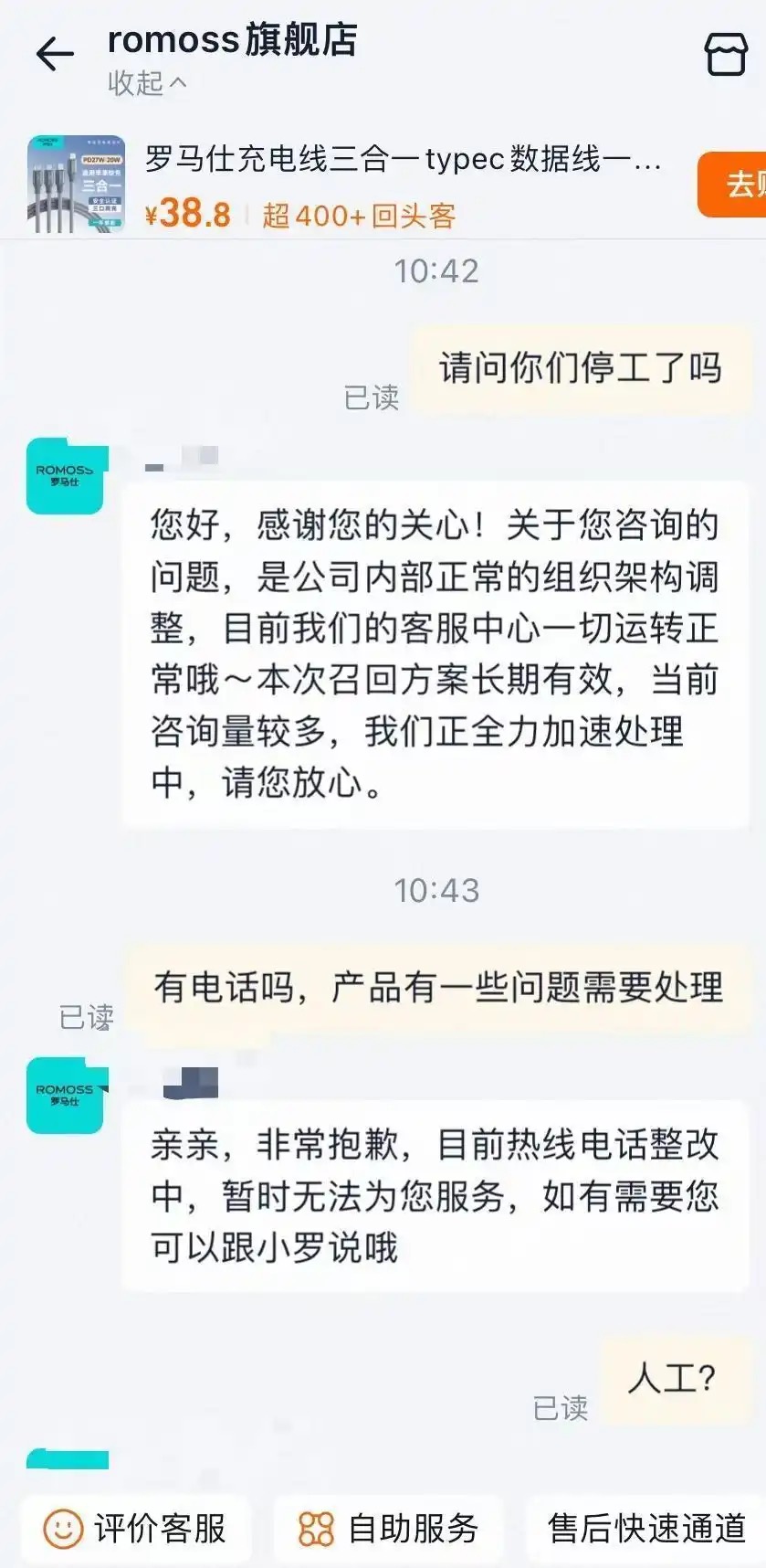 据极目新闻报道,12月12日,记者联系罗马仕旗舰店客服,对方表示,“停工是公司内部正常的组织架构调整,目前客服中心一切运转正常。”不过其又表示,“热线电话目前正在整改中,暂时无法服务。”记者随后致电罗马仕公开联系电话,无人接听。