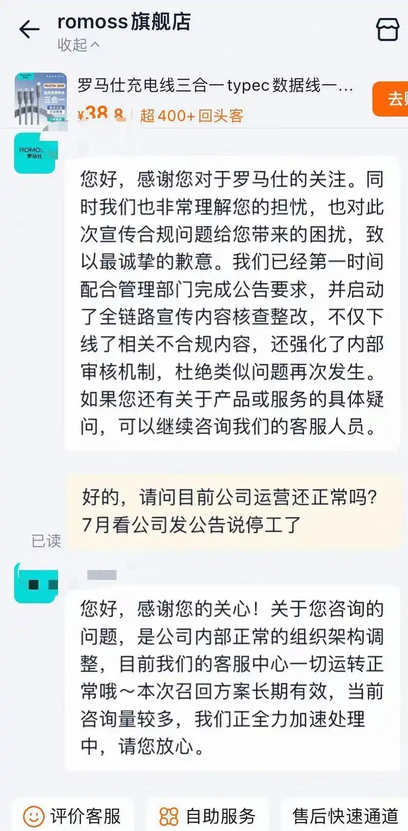 针对虚假宣传相关问题,记者咨询罗马仕的线上购物平台客服。工作人员回复称:“对此次宣传合规问题给您带来的困扰,致以最诚挚的歉意。我们已经第一时间配合管理部门完成公告要求,并启动了全链路宣传内容核查整改,不仅下线了相关不合规内容,还强化了内部审核机制,杜绝类似问题再次发生。”