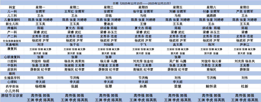 儿科、产科、五官科、眼科、生殖医学科、急诊科、皮肤科、疼痛科、康复科等科室排班表(点击排班表图片可放大查看)