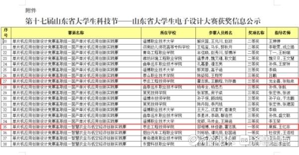 在山东省大学生电子设计大赛——单片机应用创新设计竞赛高职组赛事中,信息工程系学生邵相博、林佳薇、霍志凯三位同学组成的团队凭借新颖的设计思路与创新性的作品表现,荣获“智慧农业与低空经济创新实践赛”一等奖;霍志凯、王鹏程、刘存善团队协作攻坚,展现出扎实的单片机应用能力,荣获“国产单片机应用创新实践赛”三等奖。
