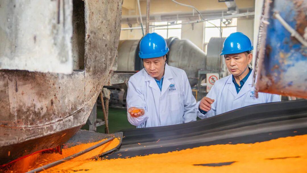 杨越超(左)指导农大肥业包膜控释肥生产与现场,查看肥料产品质量。