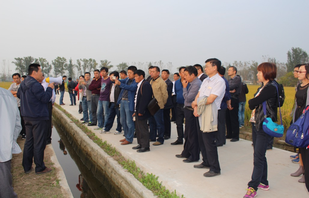 杨越超在济宁市任城区水稻田培训技术人员与种田大户,教他们如何使用包膜控释肥。