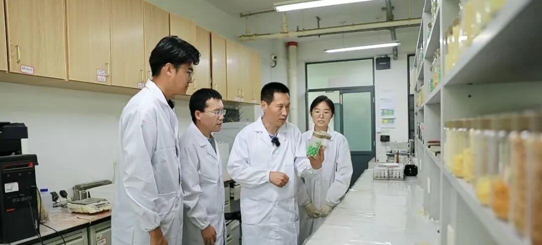 杨越超(左三)在实验室指导博士研究生开发生物基材料包膜控释肥新产品。