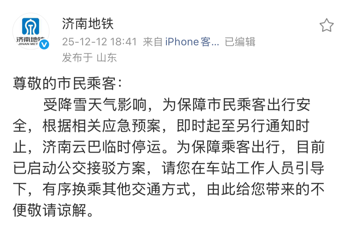 12月12日晚,济南轨道交通集团发布《济南云巴临时停运公告》。公告称,受降雪天气影响,为保障市民乘客出行安全,根据相关应急预案,即时起至另行通知时止,济南云巴临时停运。
