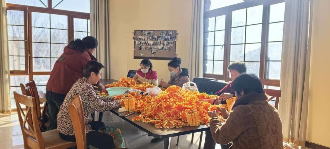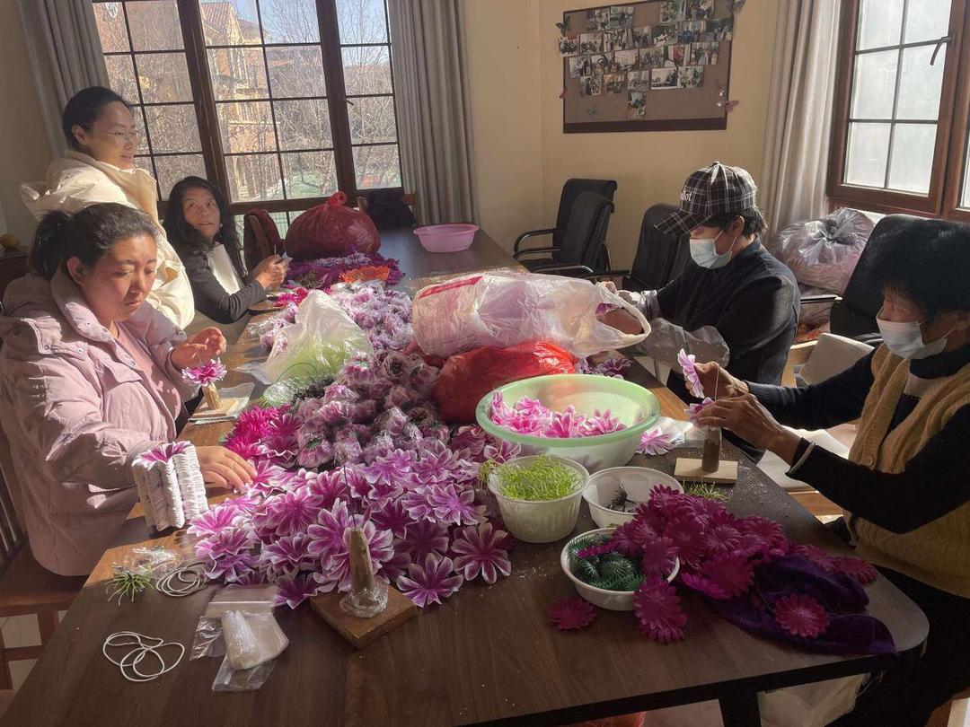 曾经只能围着灶台和孩子打转的侯女士,如今已是工坊的“领头人”,她一边指导着老人粘花瓣,一边笑着说:“以前想挣钱就得舍下孩子去城里,现在在家门口就能干活,既能顾家,还能有收入,日子踏实多了!”