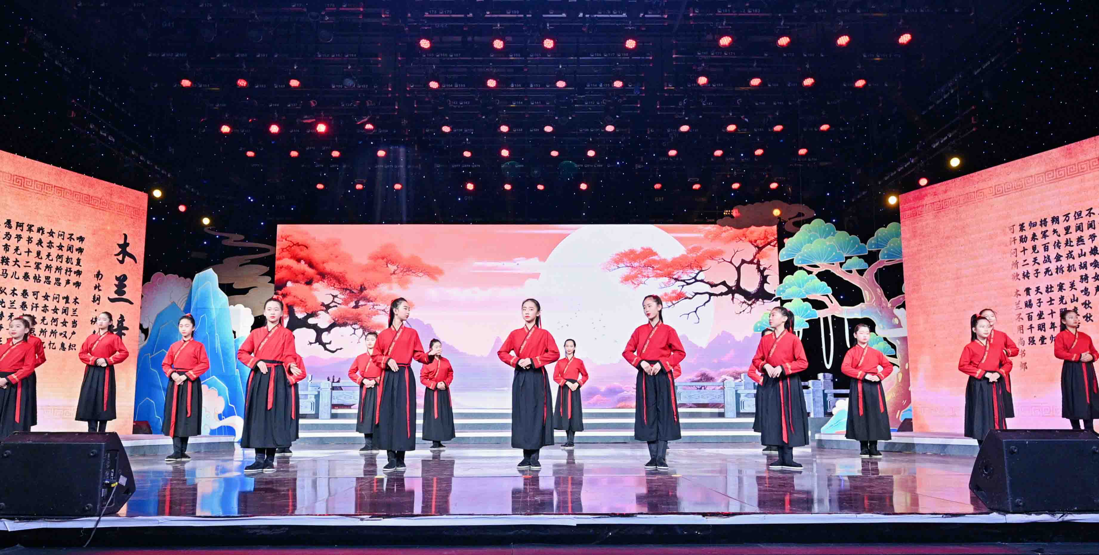 来自全市各个学段的学生代表以声情并茂的经典诵读、沉浸式情景演绎、民乐合奏、歌舞表演等多种形式,精彩演绎了《茉莉花》《诗经·关雎》的温婉雅致、《木兰辞》的飒爽担当、《大学》《道德经》的修身之道、《望岳》《满江红》的浩然正气,让千年文化在当代舞台上焕发新生。