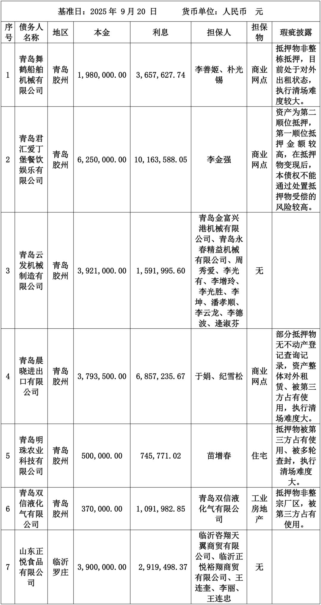 4.如清单中债务人、债权金额、担保人及担保物等信息与事实不符的,以相关合同、生效法律文书等为准。