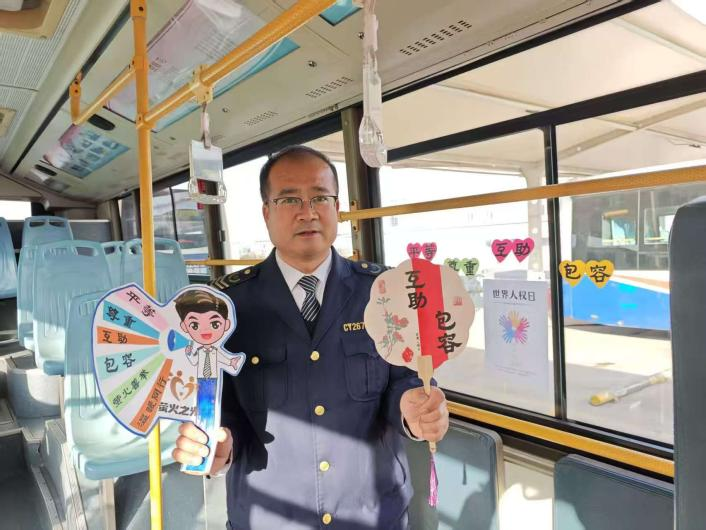 城阳巴士第十三分公司374路公交车变身“移动的人权宣传阵地”,驾驶员邱月山打造的“萤火微光·共护人权”主题车厢正式亮相。走进车厢,蓝色主调与暖黄色萤火装饰交相辉映,既呼应人权日官方标识,又延续了“诚载美好”的企业文化。前门的“人权关键词墙”上,“平等”“包容”“互助”等便签纸层层叠叠,乘客们纷纷手写感悟补充其上;过道扶手缠绕着印有人权短句的丝带,座位靠背张贴漫画面诠释“老弱病残孕优先”。更引人注目的是邱月山亲手制作的文创作品——印着“互动、包容,也传递尊重”的团扇、刻有“萤火善举,温暖同行”的艾草锤,整齐摆放在后门区域,供乘客免费取用。