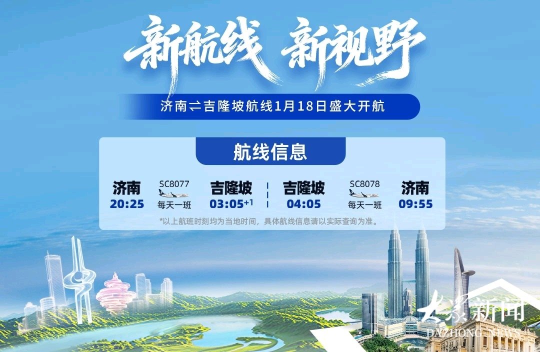 2026年1月18日,由山东航空执飞的济南⇌吉隆坡航线将正式开航。该航线的开通,不仅将千年泉城与“亚洲魅力之都”紧密相连,更标志着山航在构建山东至东南亚高效空中通道的蓝图上迈出了坚实一步。这是山航积极响应共建“一带一路”倡议、服务构建新发展格局的重要体现,为促进区域互联互通与经贸文化交流注入了新动能。