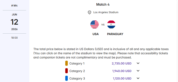 比赛门票价格因场次、比赛地点和参赛队伍而异。对于当地球迷来说,美国队第一场小组赛(在洛杉矶对阵巴拉圭队),最便宜门票的定价为1120美元(约合7901元人民币)。