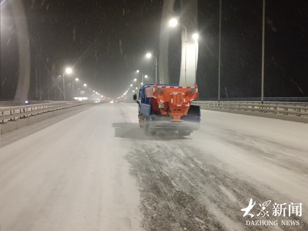 雪情就是命令,守护刻不容缓。19时许,联通路、中润大道、鲁泰大道、姜萌路孝妇河桥等7座桥梁桥面率先出现积雪,桥梁及上下陡坡作为易结冰、易打滑的关键路段,直接关系市民出行安全。融雪剂撒布组即刻集结、快速行动,针对7座桥梁及辖区一类、二类、三类道路、孝妇河沿河路的重点风险路段,精准撒布融雪剂20吨,从源头遏制路面结冰隐患。22时起,雪滚作业车辆梯队接续上阵,对主干道路展开拉网式清理,寒夜中,作业人员顶风冒雪、轮班值守,机械轰鸣声成为守护平安的 “暖心信号”。
