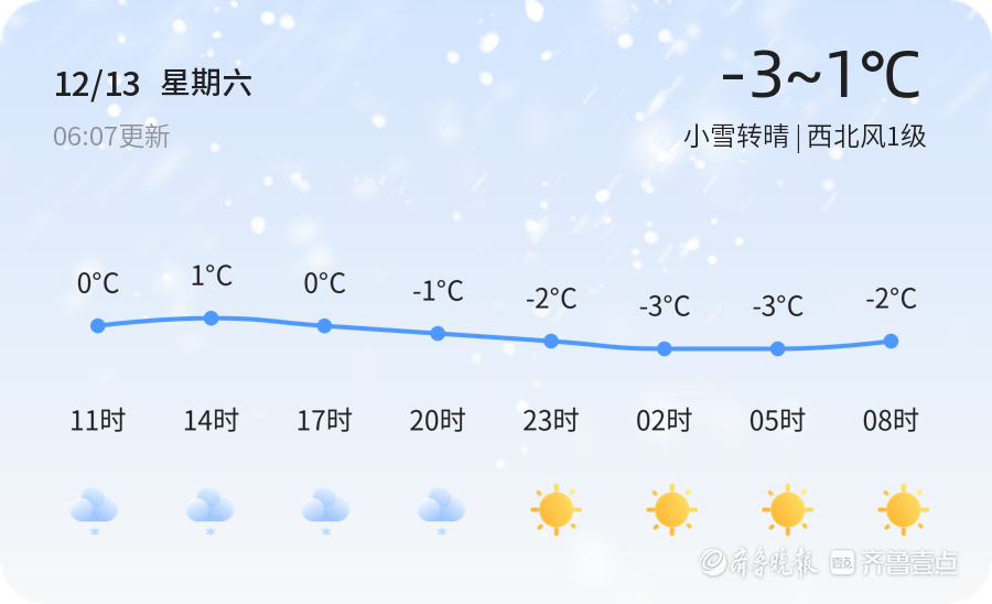 今日是12月13日,农历十月廿四,星期六。日照市迎来了一轮小雪天气,气温在-3℃至1℃之间波动,西北风1级,空气湿度88%,空气质量状况为优(PM2.5值为32)。今天的天气对市民出行有一定影响,建议市民出行时注意保暖,尤其是早晨和夜间,路面可能结冰,驾车需谨慎慢行,确保行车安全。