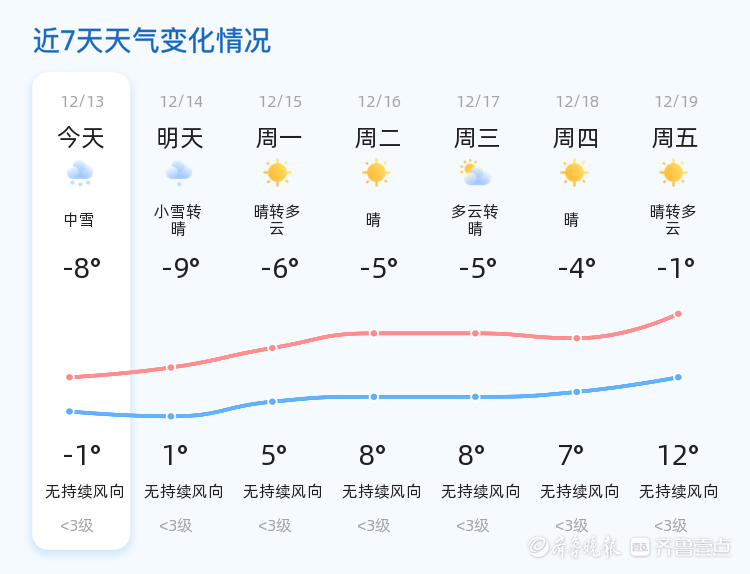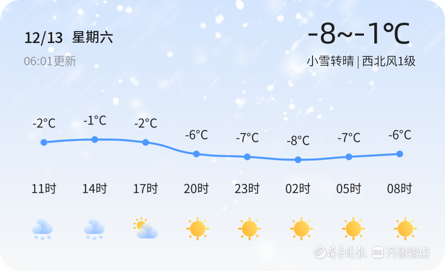 今天是12月13日,星期六,农历十月廿四。淄博市迎来小雪转晴的天气,气温在-8℃到-1℃之间。各区普遍出现降雪,气温较低,市民出行需注意防寒保暖。