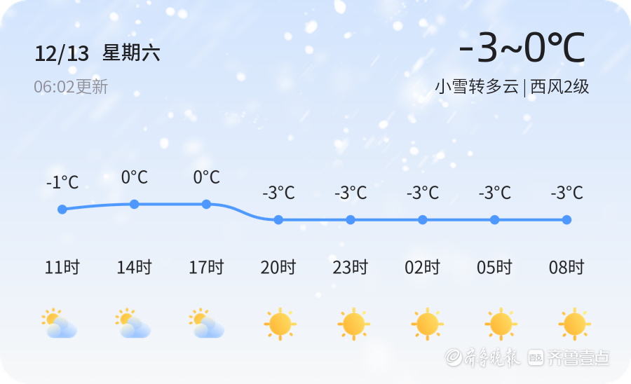 今天是12月13日,农历十月廿四,星期六。东营市迎来小雪转多云天气,气温在-3℃到0℃之间,西风2级,空气湿度88%,空气质量良好(PM2.5为25)。由于气温较低,市民出行时请注意保暖,尤其是早晨和夜间,道路可能结冰,驾车需谨慎慢行。建议市民携带雨具,以防降雪影响出行。