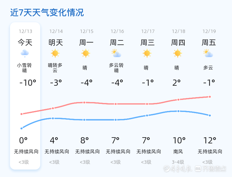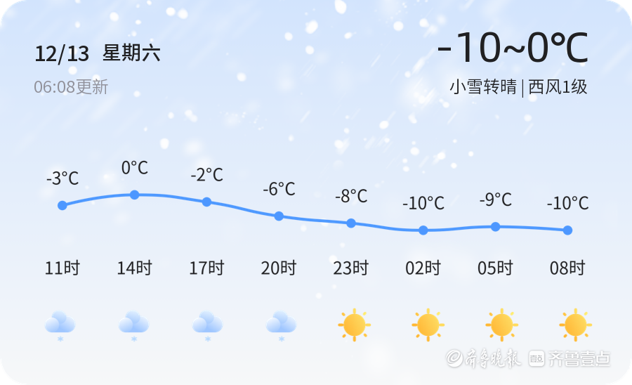 今天是12月13日,星期六,农历十月廿四。聊城迎来小雪转晴的天气,早晨气温较低,最低气温为-10℃,最高气温为0℃。今天白天,聊城各区普遍有小雪天气,风力较小,为西风1级,空气湿度较高,达到94%。市民朋友们在享受冬日雪景的同时,也要注意防寒保暖,防范道路湿滑带来的安全隐患。