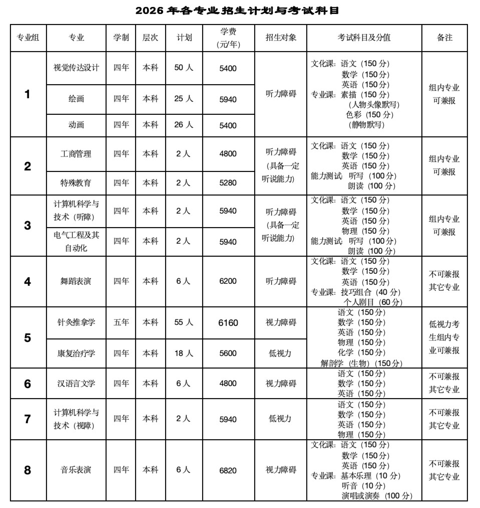 根据招生简章内容,此次计划招生202人,招生专业丰富多元,涵盖13个专业方向:包括视觉传达(50人)、绘画(25人)、动画(26人)、工商管理(2人)、特殊教育(2人)、计算机科学与技术(听障)(2人)、电气工程及其自动化(2人)、舞蹈表演(6人)、针灸推拿学(55人)、康复治疗学(18人)、汉语言文学(6人)、计算机科学与技术(视障)(6人)、音乐表演(6人)等13个专业,兼顾艺术、管理、教育、工科等多个领域,满足不同残障学子的专业发展需求。其中,计算机科学与技术专业特别标注面向听障、视障考生。