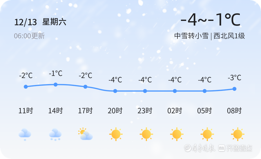 今天是12月13日,星期六,农历十月廿四。济南市迎来中雪转小雪天气,气温较低,最高气温-1℃,最低气温-4℃,西北风1级,空气湿度92%,PM2.5浓度为59,空气质量状况为良好。市民出行时请注意保暖,防滑防摔。雪天路滑,建议市民尽量选择公共交通工具出行,减速慢行,确保行车安全。