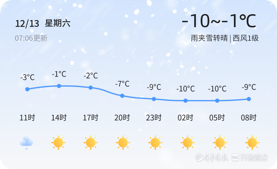 今天是12月13日,农历十月廿四,星期六。德州市迎来雨夹雪天气,气温较低,全市各区最低气温普遍在-10℃左右,最高气温为-1℃。目前,德州市气温为-3.2℃,天气状况为雨夹雪转晴,西风1级,空气湿度为96%,PM2.5指数为48,空气质量良好。市民出行请注意防寒保暖,防范道路湿滑。