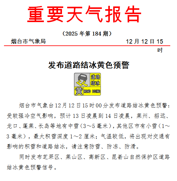 同时发布芝罘区、莱山区、高新区、昆嵛山自然保护区道路结冰黄色预警信号。