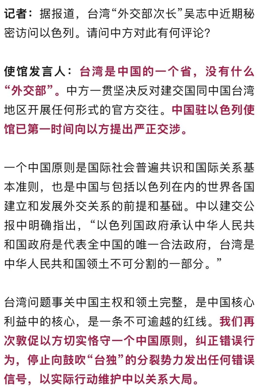 中方向以色列提出严正交涉以馆为家 2025-12-13 09:04:10据中国驻以色列大使馆12月13日消息,台湾当局外事部门官员吴志中近期秘密访问以色列,中国驻以色列使馆已第一时间向以方提出严正交涉。责任编辑:韩雨婷