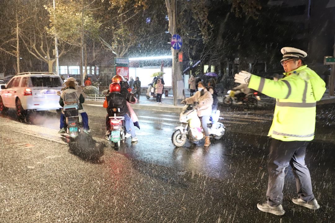 这场初雪从下午4点多开始席卷了整个辖区,由于临近晚高峰,为了保障群众的安全出行,大队进一步加大警力投入,在城区主要路口、学校附近增派警力,加大疏导力度。