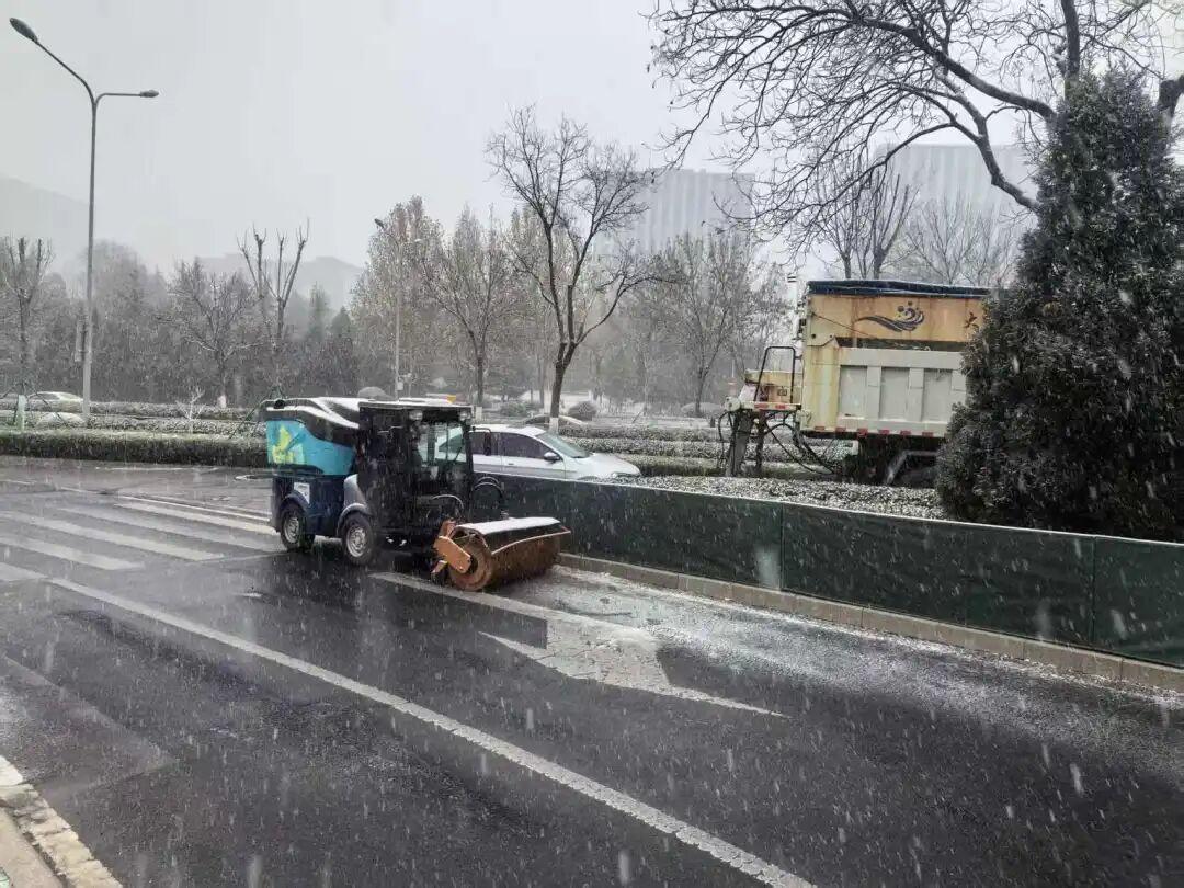 区城管局采取“机械+人工”联合作业模式,坚持主次干道优先保障,出动滚扫车、洒布机对高架路及主干道进行多轮次清雪作业,防止路面结冰。背街小巷同步推进,调配小型清雪车辆,组织环卫工人重点清理人行道、公交站台、坡道弯道等区域积雪。广泛动员社会力量,发动沿街商户、物业单位落实“门前五包”责任,共同参与清雪行动,形成全民除冰合力。截至目前,共计出动人员1540余人次;出动各类作业车辆247车次,其中,洒水车120车次、大型雪滚车50车次、撒布机35车次、推雪车12次、小型清雪车30车次,铺设防滑毡50余米。