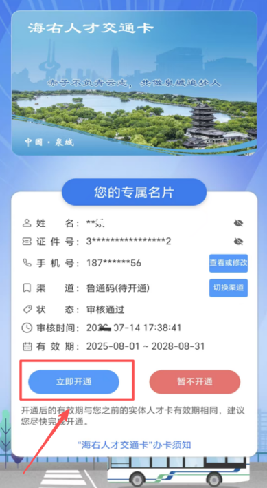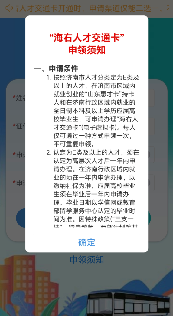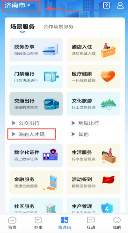 打开【爱山东APP】——【鲁通码】——注册/登录——信息授权“同意授权”——城市选择“济南市”——【场景服务】——【交通出行】——【海右人才码】,进入开通主界面。乘客市民可自行选择申请渠道(鲁通码和电子社保卡二选一),选择申请类型为“海右人才交通卡”,点击【提交】按钮,在开通界面选择【立即开通】按钮,即可显示申领成功信息界面(此界面可以切换申请渠道和修改手机号)。