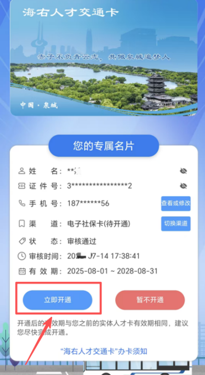打开【369出行APP】——【掌上大厅】——【海右人才码】,进入开通主界面。乘客市民可自行选择申请渠道(鲁通码和电子社保卡二选一),选择申请类型“海右人才交通卡”,点击【提交】按钮,在开通界面选择【立即开通】,即可显示申领成功信息界面(此界面可以切换申请渠道和修改手机号)。