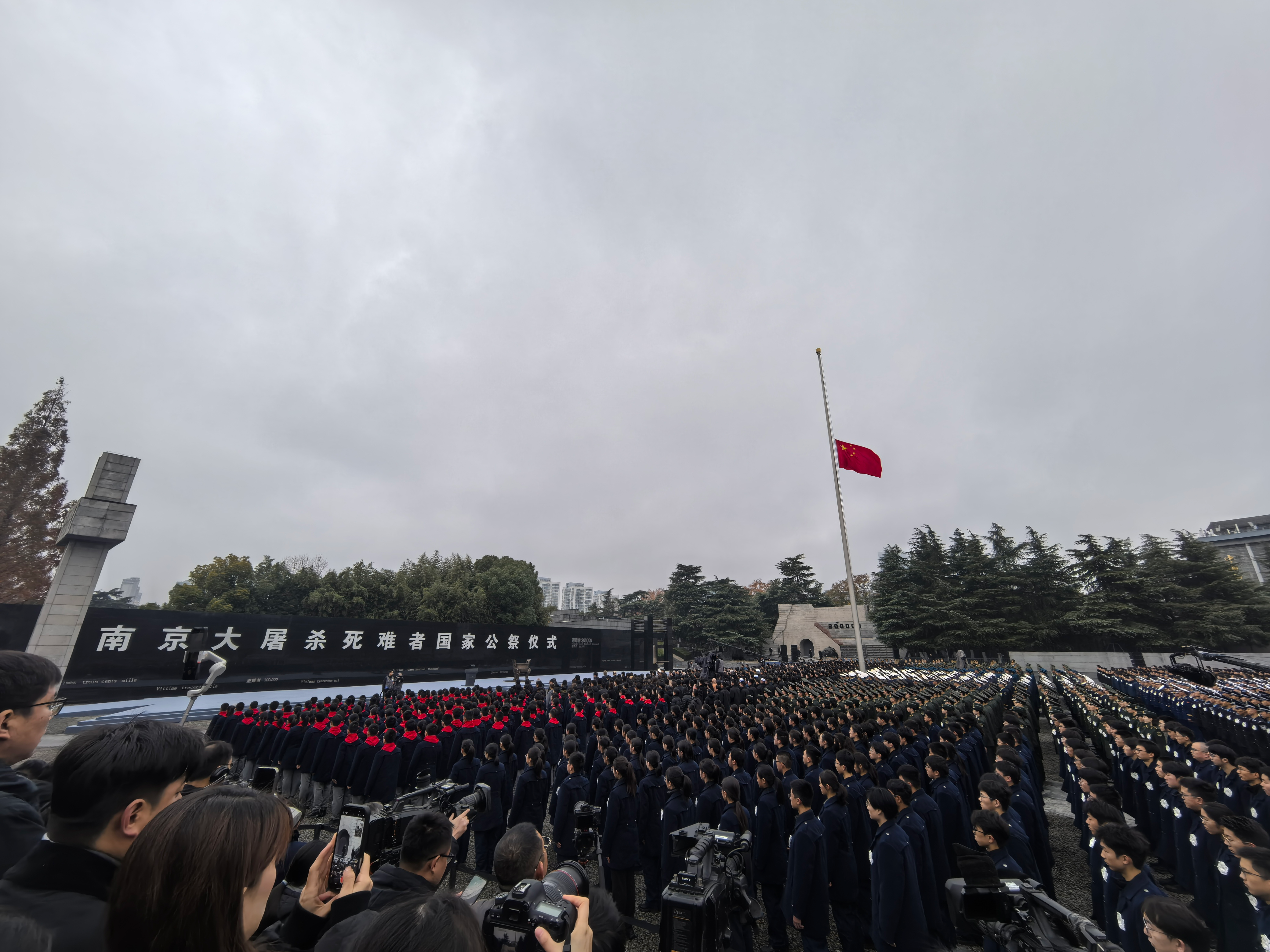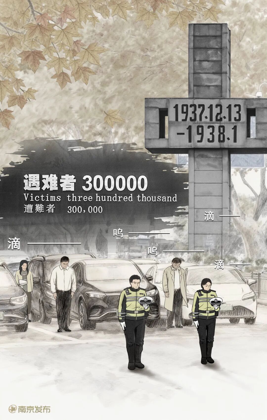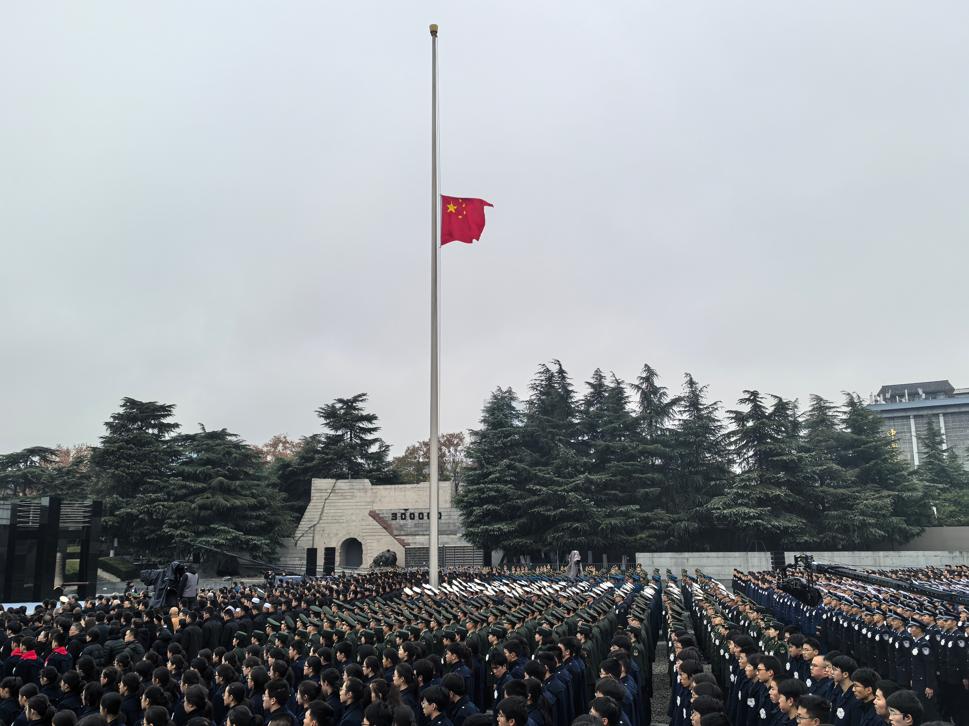 今天南京大屠杀死难者国家公祭日这里是南京天气阴有小雨上午10时国家公祭仪式在侵华日军南京大屠杀遇难同胞纪念馆举行警报声再次响彻南京上空十点零一分至十点零二分南京全城鸣响防空警报汽车火车轮船鸣笛致哀路上行人停下脚步默哀仪式现场向南京大屠杀死难者敬献花圈诵读和平宣言各界人士代表共同撞响和平大钟放飞和平鸽今天我们以国家之名祭奠人民日报客户端