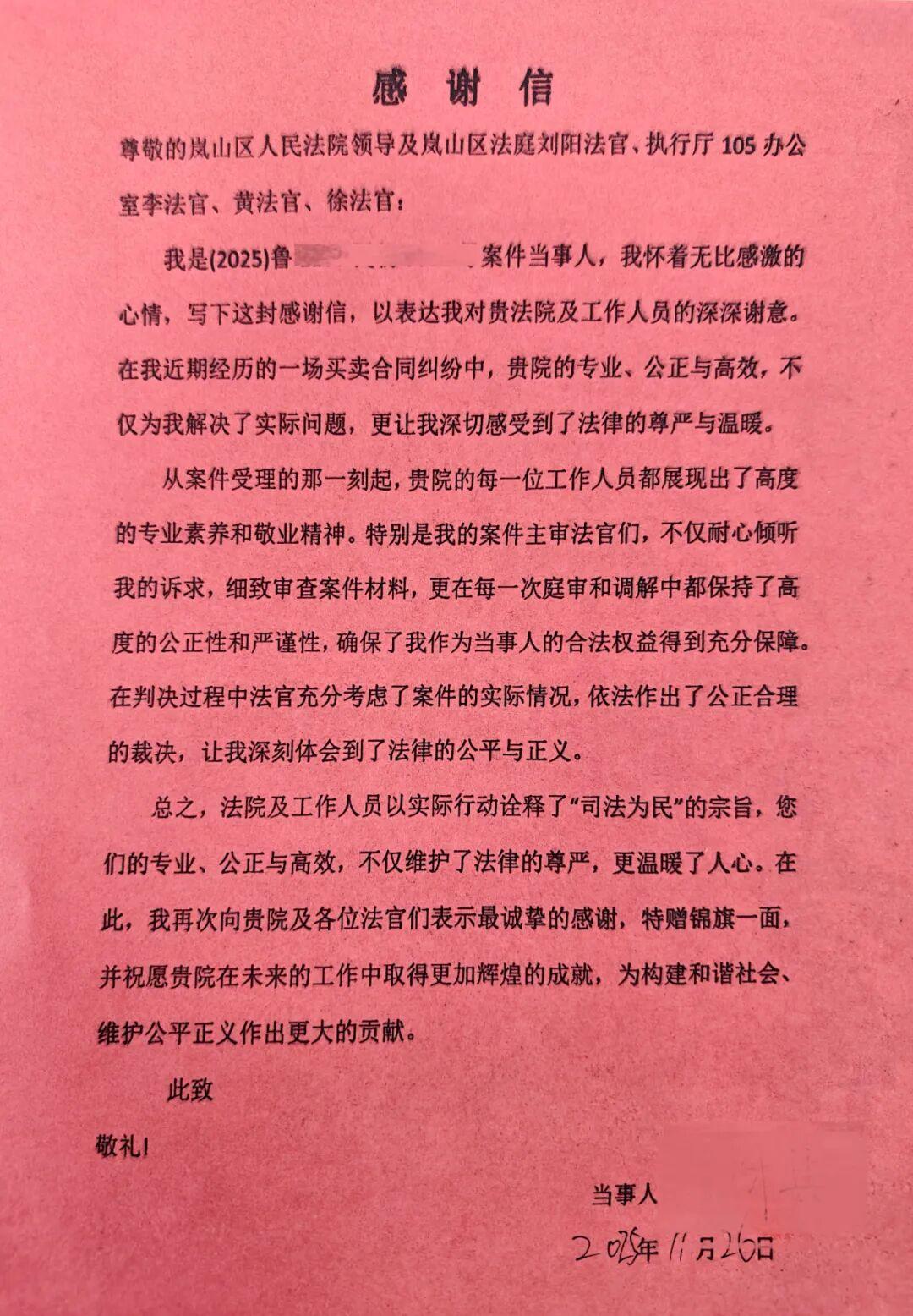 “从案件受理的那一刻起,贵院的每一位工作人员都展现了高度的专业素养和敬业精神。在每一次的庭审和执行中都保持了高度的公正性和严谨性,确保了我作为当事人的合法权益得到了充分保障,特赠锦旗一面,愿贵院在未来的工作中取得更加辉煌的成就,为构建和谐社会、维护公平正义作出更大的贡献。”苏大爷在感谢信中写道。