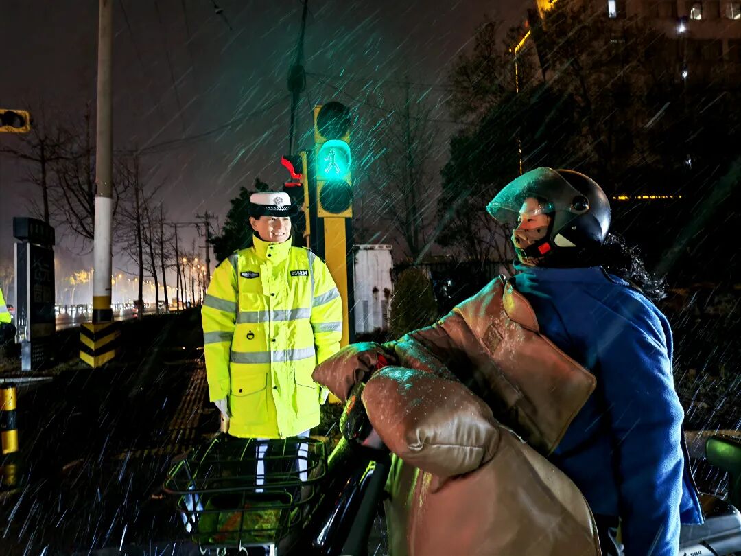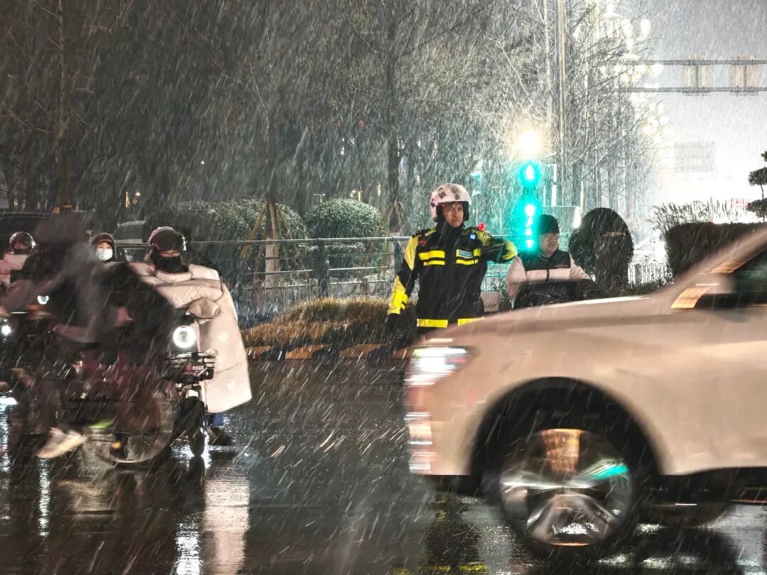 十字路口、重点路段,风雪中的“荧光绿”忙碌着指挥行人车辆安全通行