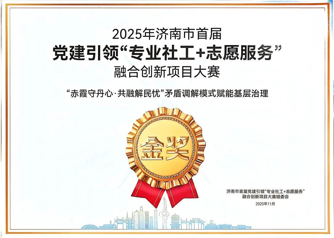 根据大赛活动安排,济南市公安局市中分局四里村派出所申报的“赤霞守丹心·共融解民忧”矛盾调解模式赋能基层治理项目,历经宣传发动、项目申报、初审筛选、优化辅导、决赛路演和现场答辩等多环节严格选拔,从全市7大重点领域169个项目中脱颖而出,荣获“金奖”、矛盾调解类项目第一名。且项目案例被中国社会工作联合会编入《2025全国社会服务创新发展大会社会工作专业服务案例选编》。