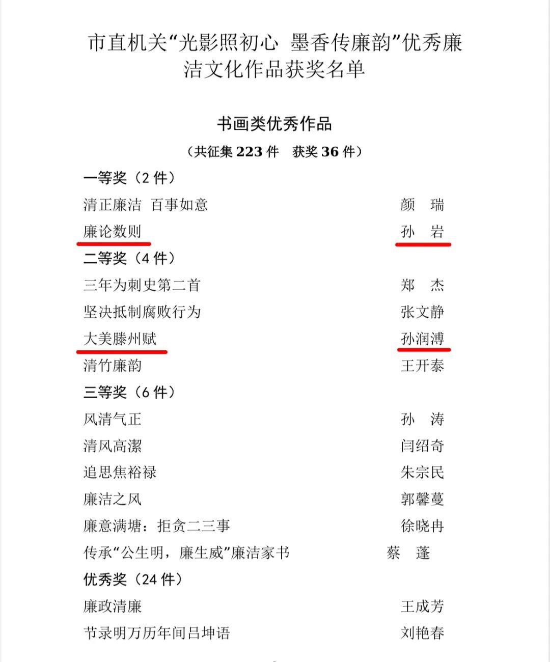 近日,滕州市委市直机关工作委员会印发《关于表扬“光影照初心 墨香传廉韵”廉洁文化作品征集活动获奖单位及个人的通报》,对市直机关廉洁文化作品征集活动进行通报表扬,市司法局选送的三件书画类作品喜获一、二等奖和优秀奖,其中孙岩同志的《廉论数则》获一等奖,孙润溥同志的《大美滕州赋》获二等奖,于浩亮同志的《篆刻》获优秀奖,市司法局还荣获“优秀组织奖”,为全市司法行政系统赢得了荣誉。