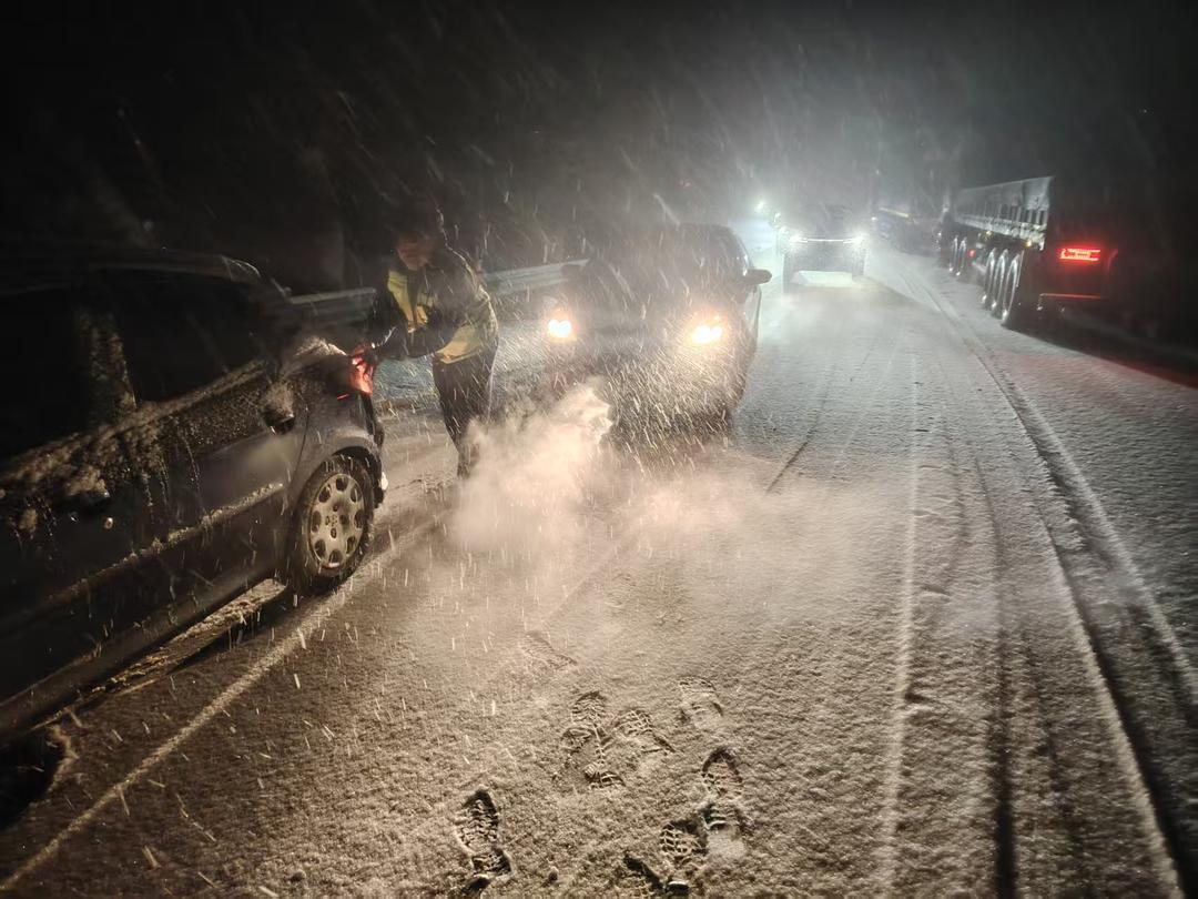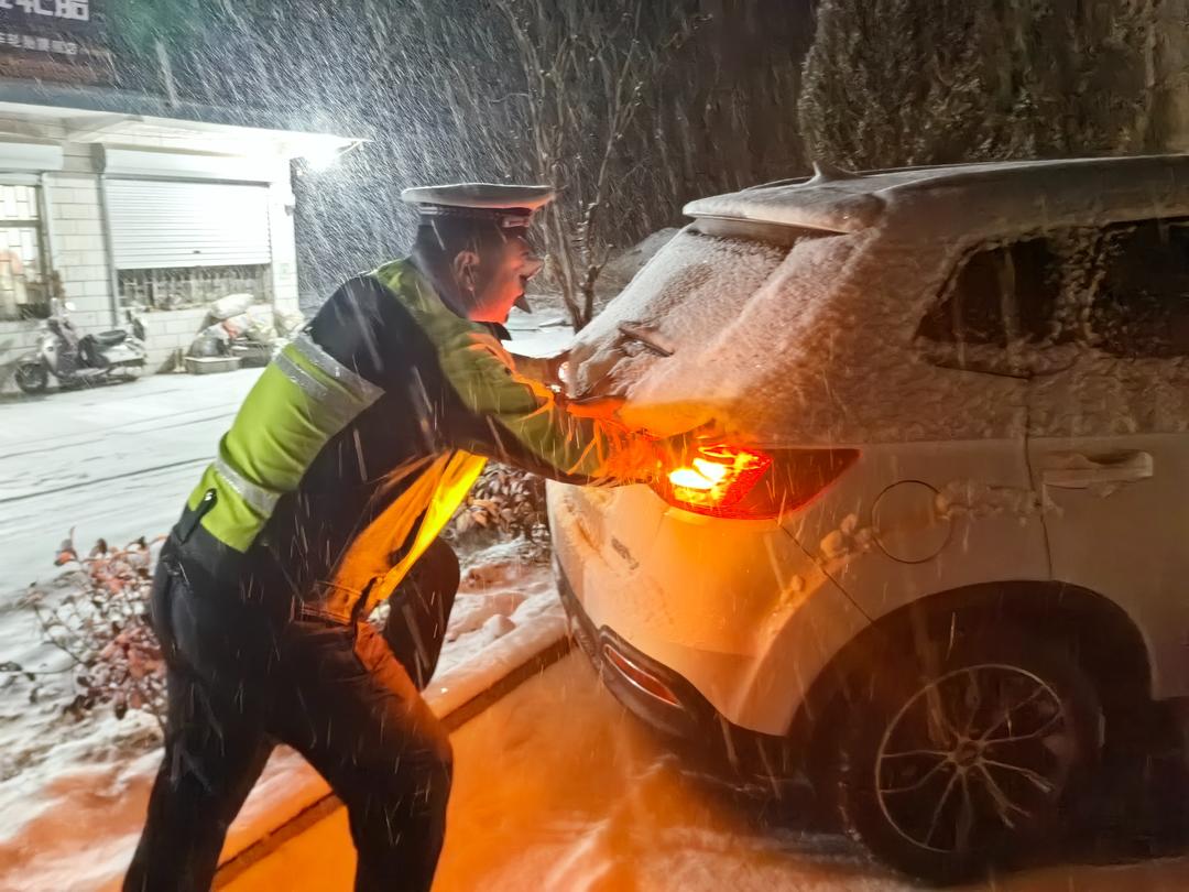 交警温馨提示:雪天路滑,请广大驾驶人减速慢行,保持安全车距,谨慎通过桥梁、弯道。及时清理车窗积雪,正确使用灯光,注意避让行人与非机动车。