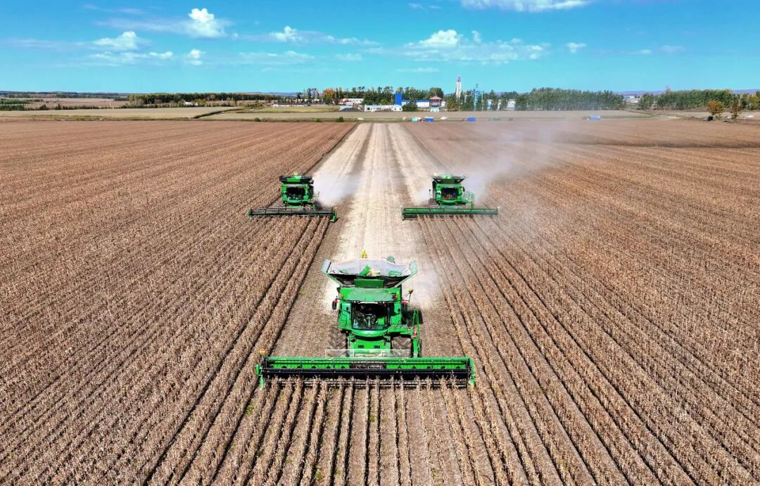 在北大荒集团黑龙江尾山农场有限公司第一管理区,农机进行大豆收获作业。新华社发