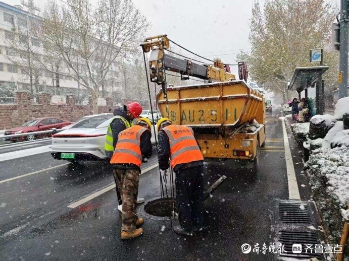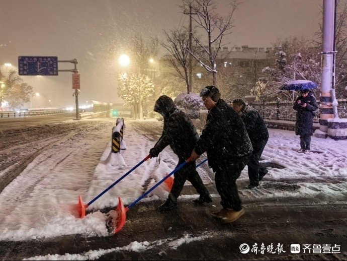 市中区水务局加强路面、井盖、排水管道巡查,及时清除积雪,保障排水畅通;各学校、医院周边、社区道路由属地街道与城管中队定点值守、优先清理;雪中,市中交警大队坚守在街头,疏堵保畅,并与清雪车辆密切配合,实现“清雪+保畅”一体化作业;雪夜零下3摄氏度,市中区街头,“城市美容师”们仍坚守岗位,顶风冒雪清扫积雪,确保主路积雪随下随清,早高峰前实现“雪停路净”。