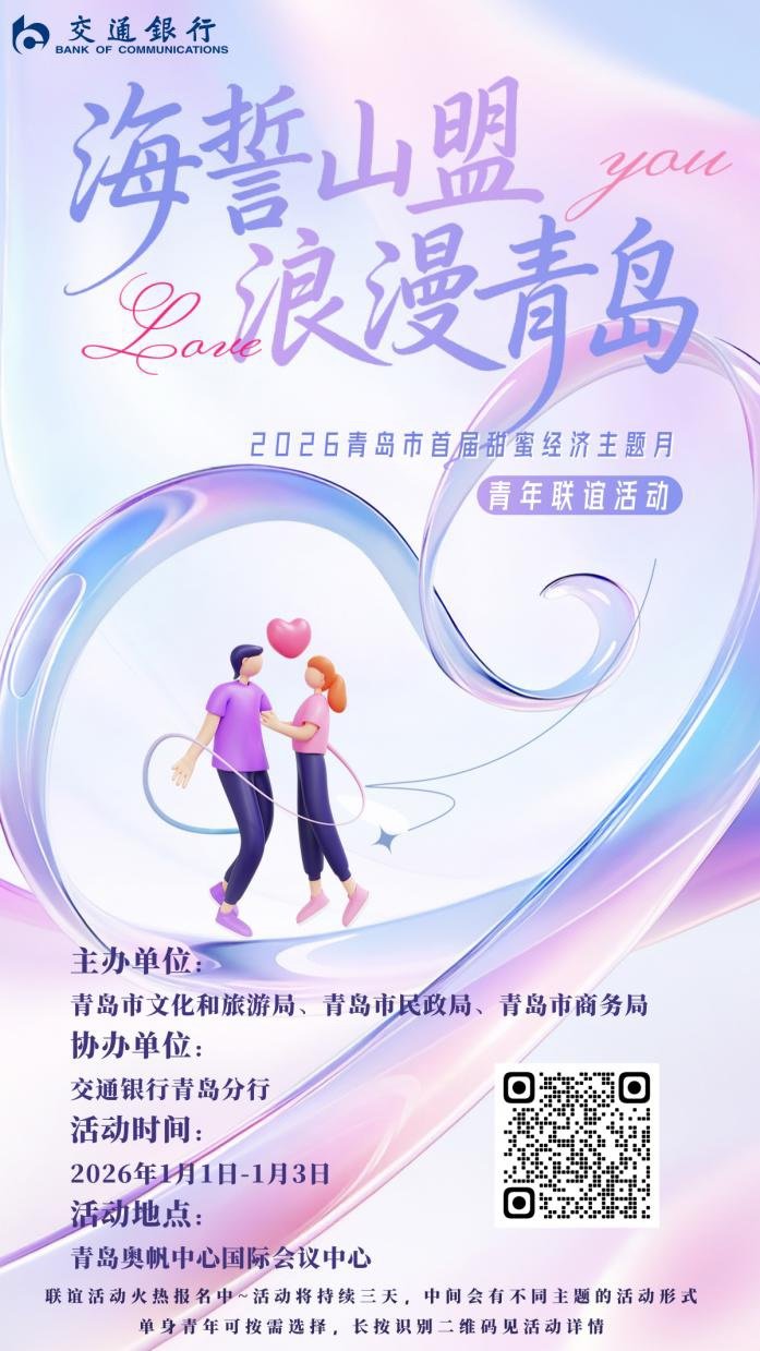2026年1月1日下午,“2026青岛市首届甜蜜经济主题月——海誓山盟·浪漫青岛 青年联谊活动”浪漫启幕,活动将持续三天,举办五场主题不同的联谊活动,现正式面向青岛全市招募单身青年,共赴这场浪漫之约!