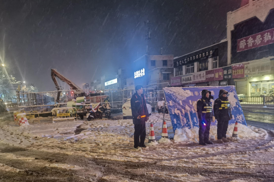 夜幕中寒雪袭城,正在施工中的道路变得愈加难以通行,为防范车辆误入施工区域造成二次事故,济南人保财险理赔中心派出专人协同交警、路政部门联合开展道路巡查和车辆导向分流,以专业之姿为泉城市民财产安全保驾护航。