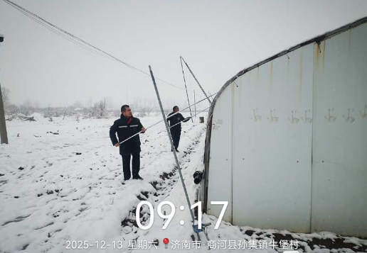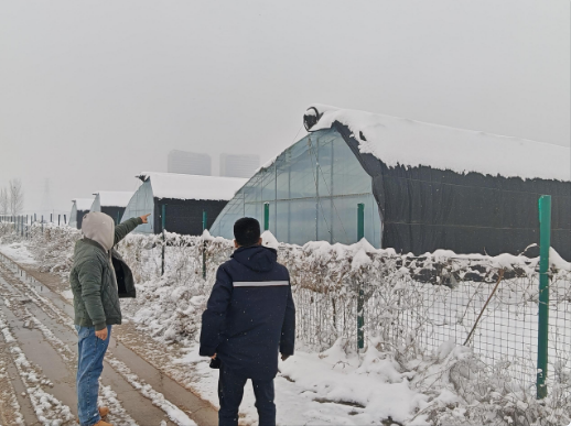 在济南长清区、商河县,理赔分部根据应急预案全员深入田间走访农户,巡查大棚受损情况,协助农户清理大棚积雪,提醒农户风险预警。
