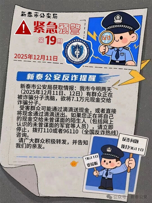 新泰市公安局获取情报:新泰市今明两天(2025年12月11日、12日)有群众正在被诈骗分子洗脑,欲将7.1万元现金交给诈骗分子受害群众可能通过滴滴送现金,或者直接将现金通过滴滴送出。如果您正在将自己的现金交给未曾谋面的陌生人(包括网上认识的未曾谋面的军官等人员),请立即停止,拨打110或者96110(全国反诈热线)咨询。