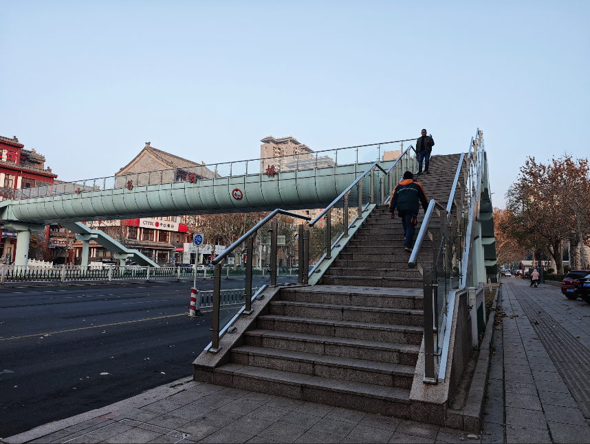 记者注意到,该天桥位于虞河路与南乐道街交叉口,是医院周边主要过街通道。每天有大量患者及家属通过此桥往返,人流量较大。
