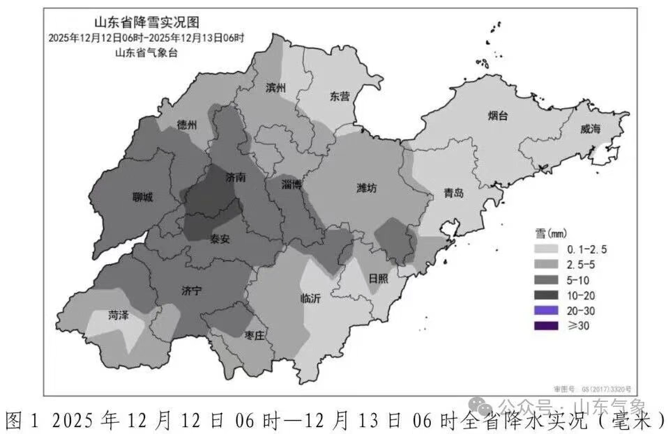 据山东气象微信公众号,12月12日06时至13日06时,全省大部地区出现降雪,平均降雪量4.2(毫米,下同),折合水量约6.6亿方。各市平均:泰安9.1、济南8.6、聊城7.2、济宁5.8、德州5.0、淄博4.8、潍坊4.0、枣庄3.8、菏泽3.8、滨州3.4、临沂2.7、东营2.5、青岛2.3、日照1.8、烟台1.2和威海0.3。县(市、区)平均降雪量超过10.0的4个,5.0-10.0的41个,2.5-5.0的43个,前3位的是:泰安泰山14.3、济南市区12.5和济南长清12.0。今年以来全省平均降水量866.2毫米,较常年同期偏多202.6毫米(31%)。