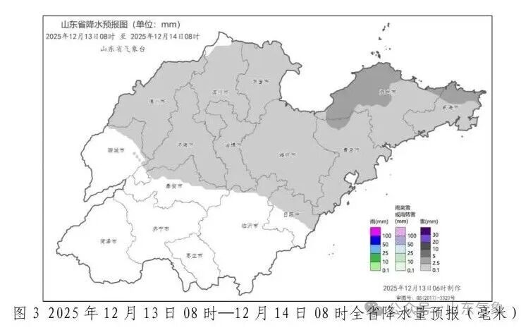 13日白天到夜间,烟台北部和威海北部天气阴有中到大雪局部暴雪,德州、滨州、东营、日照、青岛、烟台南部、威海南部和鲁中地区天气阴有小雪局部中雪转晴,其他地区天气阴转晴。滨州、东营、潍坊、日照、半岛地区和内陆湖面北风3~4级增强到4~5阵风6~7级,其他地区北风转南风3~4级。夜间最低气温:聊城、德州、济南南部、泰安、淄博、菏泽和济宁-10~-8℃,沿海地区-4~-1℃,其他地区-7~-5℃。最高气温:鲁南和沿海地区2℃左右,鲁中山区-2℃左右,其他地区1℃左右。