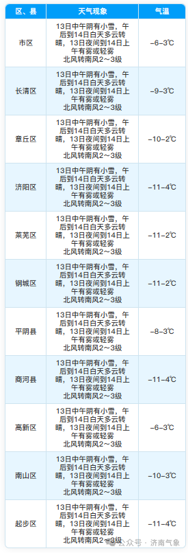 据济南气象微信公众号,济南13日中午阴有小雪,降水概率90%,午后到14日白天多云转晴,13日夜间到14日上午有雾或轻雾,北风转南风2~3级,最低气温市区-6℃左右,其他区县-11~-6℃,最高气温3℃左右。