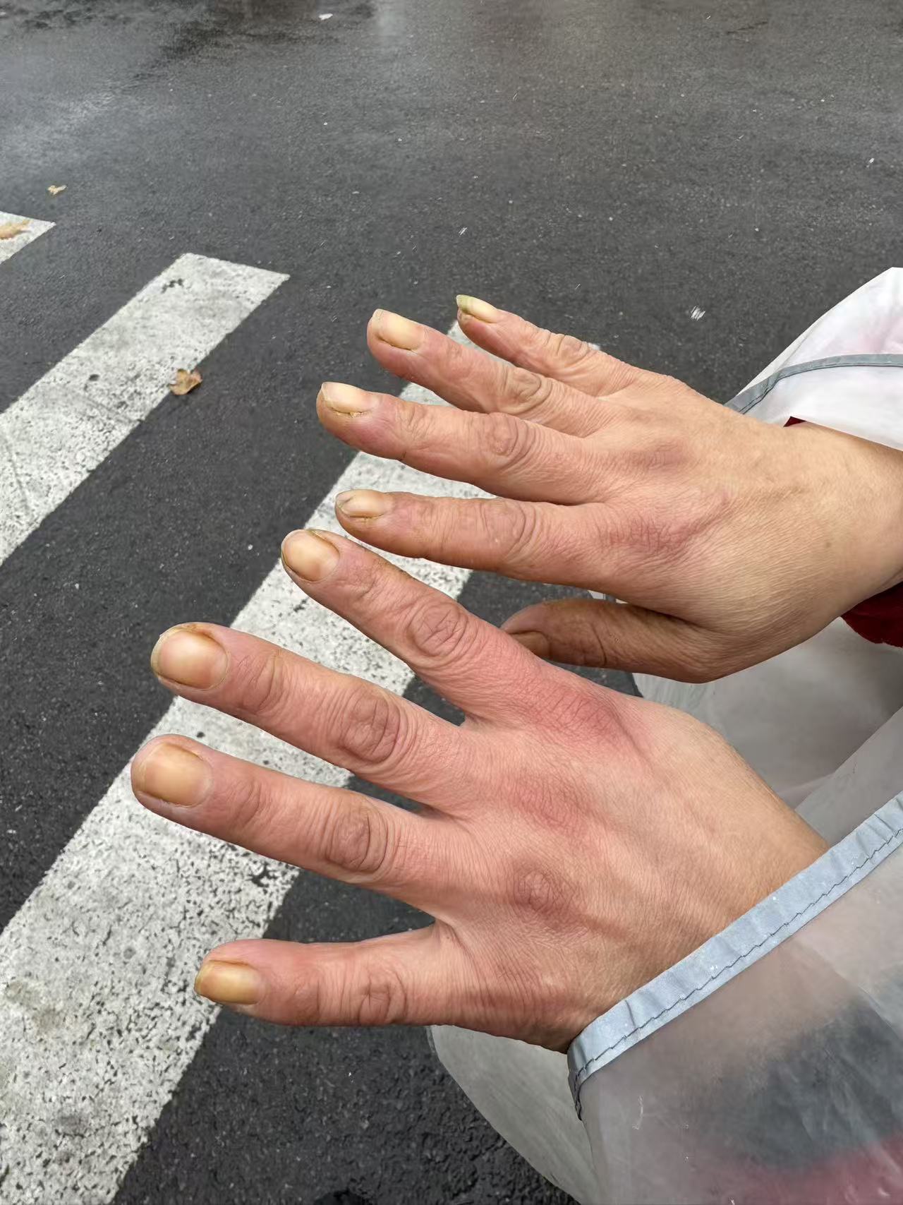 连续作业的疲惫,藏在细节里。她的手套早已被雪水浸湿,手指冻得发僵,皮肤因为低温和摩擦出现红肿和裂口。弯腰、起身、再弯腰,动作一遍遍重复,节奏单调,却不敢慢。在她身后,队友曹令秋同样埋头除雪。“有时候光顾着干活,连几点了都不知道。”她说这话时有些不好意思。